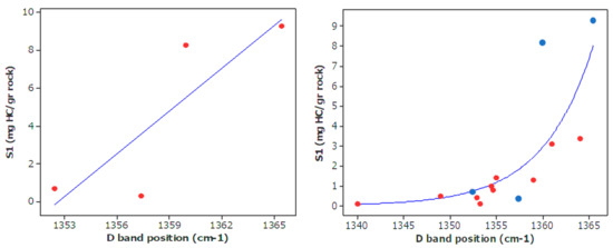 By increasing maturation and consequently hydrocarbon production, the heteroatom-rich OM lose their oxygenated/hydrogenated groups [87,88,89], as a consequence attachment that separate from aromatic carbons increase [27,90]. The D band signals (~1350 cm−1) refers to a disorder in the atoms representing discontinuities and defects of the sp2 carbon network, for instance, as in heteroatoms [5,27]. Consequently, D band can be utilized as an indicator of attachments separated from OM, which is happening throughout hydrocarbon generation. Thus, already generated hydrocarbon (S1) can be correlated with D band, Figure 14. According to previous studies [40,54], when maturity increases, the D band shifts towards lower wavenumber (1370 to 1330 cm−1) and displays lower intensities. This is related to the increase of separating attachments from aromatic groups and transforming the organic matter from disordered state to more ordered molecule [91]. The disappearance of the D band in the uppermost stage of maturity also verifies this phenomenon.
