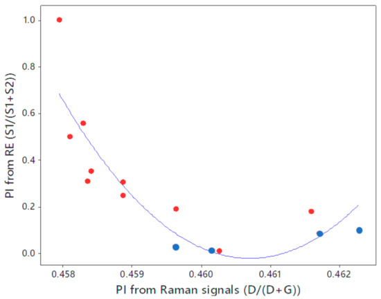 Correlation between PI from Rock-Eval and PI based on definition using Raman signals. Data from other sources (red circles) [5,85,86], including samples in this study (blue circles) with 78% R2. PI data from other sources were calculated based on the definition, as they did not report PI directly.