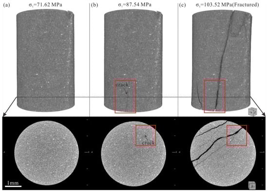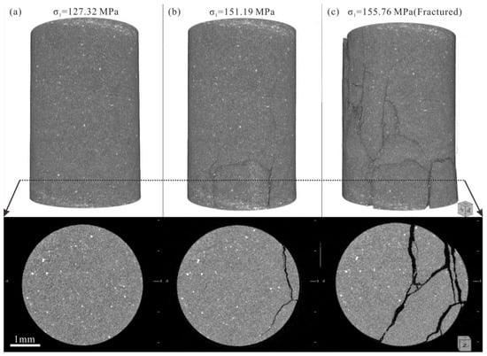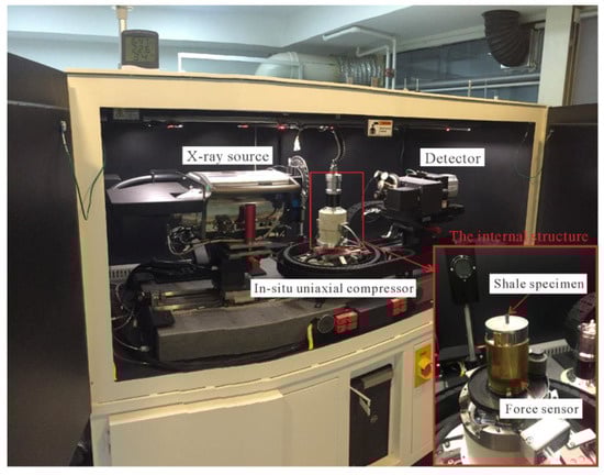 Various experimental methods, e.g., electromagnetic radiation (EMR), acoustic emission (AE), micro-seismic (MS), infrared technique, high speed digital imaging, and computerized tomography (CT), have been used to analyze the mechanical behavior of rocks (including shale) during uniaxial or triaxial loading [,,,,,,]. CT scanning has been widely applied in the investigation of damage propagation since 1997, due to the three-dimensional (3-D) visualization and high-resolution imaging [,,,,,,]. Kawakata et al. used CT to study the initial mesoscopic damage characteristics of rock materials, and observed spatial fault development in granite undergoing compression [,]. In the experiment, only the damaged specimens, rather than the entire process from crack initiation to specimen destruction, were scanned, and then observed by 3-D reconstruction of X-ray CT images. To examine the entire process, Ge et al. investigated rock compression with a real-time CT test []. Through the use of the industrial CT images, the rock meso-damage propagation law was revealed. Rock failure started with micro-pore and micro-crack compression, growth, bifurcation, and development, followed by fracture. Sun et al. displayed real-time deformation in backfill body under loading using industrial CT in several slices, and provided insights into the process of faulting []. However, the relatively low spatial resolution and image quality of conventional industrial CT is not suitable for fine-grained rocks. Furthermore, the 3-D information was not fully captured or used, which limited the accuracy of further calculation when analyzing with limited slices. Thus, micro-CT with better spatial resolution became a better option for observing and analyzing micro-cracks in shale [,,].