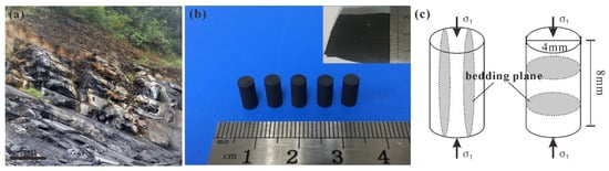 Shale is a laminated sedimentary rock composed of highly compacted and fine-grained particles of micrometer to sub-micrometer size, with nano- to macro-scale heterogeneity []. Over the last decade, significant attention has been given to organic-rich shale in the petroleum industry, for its gas-bearing properties and associated prospects of massive gas reserves [,]. However, it is characterized by low porosity and permeability, thin beds, and strong anisotropy between parallel and perpendicular directions to bedding, which greatly increase the difficulty of gas extraction [,]. The application of new techniques, e.g., hydraulic fracturing and horizontal drilling, have significantly promoted gas production [,,], which has benefited from the investigation of mechanical properties and anisotropic brittleness of shale at multiple scales [,,,,]. The understanding of fracture generation and propagation with different bedding orientation remains a key step to successful well drilling (well bore stability) [].