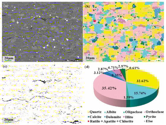 Based on a 300 μm × 300 μm region of a BSE image (Figure 3a), the mineral compositions of shale specimens were obtained using AMICS (Figure 3b). Clay minerals, albite, and organic-matter are aligned parallel to the bedding (Figure 3a). The quantitative AMICS results (Figure 3d) show that the quartz content in Longmaxi Formation shale is approximately 32.62 wt %. Other minerals include orthoclase (35.42 wt %), plagioclase (albite and oligoclase, 17.33 wt %), carbonates (calcite and dolomite, 5.99 wt %), clay minerals (illite, 4.73 wt %; chlorite, 0.02 wt %), pyrite (2.97 wt %), and minor rutile and apatite (0.33 wt %). Brittle minerals (quartz, feldspar and calcite []) dominate (88.49 wt %) the Longmaxi shale. Calculations based on gray-scale segmentation of the BSE image using the ImageJ program indicate that both organic matter and pores account for about 2.66% of the total area in the Longmaxi shale (Figure 3c).