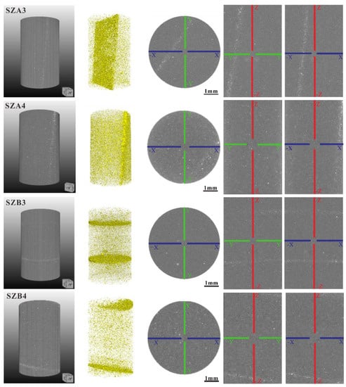 The 3-D micro-CT images of shale specimens before uniaxial loading (see Figure 4) show that pyrite in the laminae has the highest density, pores have the lowest density, and organic matter is in between. Pyrite laminae are less than 100 μm thick, which are difficult to see macroscopically, but are easily detected by CT images. They developed as lens-shaped at diverse positions of both 0° and 90° specimens, indicating heterogeneity of structure and mineral composition. The volume percentage of pyrite in specimens SZA3, SZA4, SZB3, SZB4 is 2.58%, 2.09%, 1.89%, and 1.63%, respectively. No visible original fracture can be seen in the specimens, which provides good experimental conditions for comparison with crack propagation.
