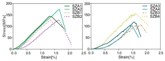 Stress-stain curves of Longmaxi shale specimens SZA1-4 and SZB1-4.