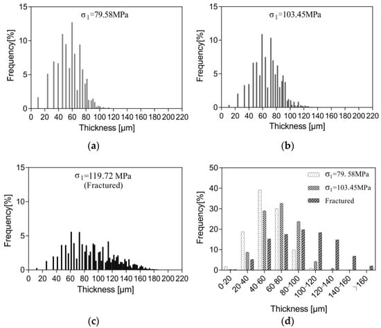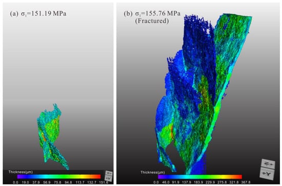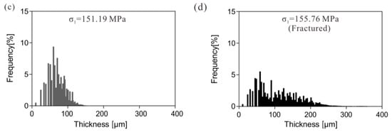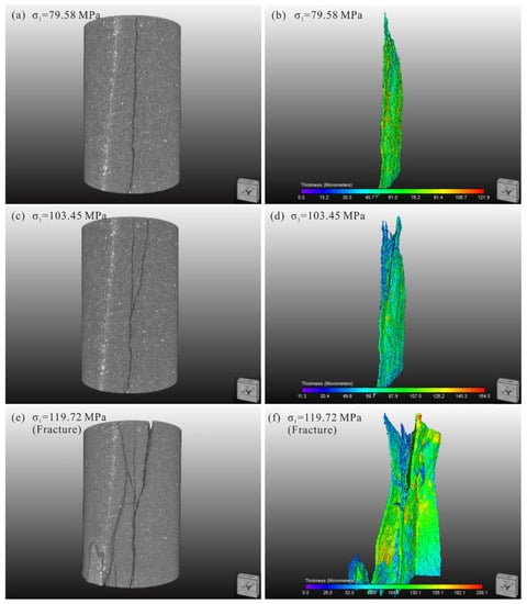 The thicknesses of micro-cracks at different compression stages show a unimodal distribution, as indicated in Figure 7. At σ1 = 79.58 MPa, the thickness of >99.99% captured micro-cracks ranges from 10.17 μm to 114.38 μm (the rest, <0.01%, have too low frequency to be displayed) and 39.16% of the micro-cracks are 60–80 μm thick. At 103.45 MPa, the thickness of >99.99% micro-cracks ranges from 10.75–127.66 μm, and the thickness of 49.93% cracks is within a range from 60–80 μm. The increase of the 60–80 μm thick micro-cracks may be caused by the development of new micro-cracks and/or the enlargement of the smaller micro-cracks that developed during the previous stage. In addition, a secondary crack emerged in the middle of the specimen, connected to the primary crack and with a smaller crack on one side. Of the micro-crack thickness, 99.99% of completely fractured specimens ranges from 11.83–193.23 μm. The 40–120 μm micro-cracks accounted for 85.65%, indicating that the micro-cracks of different thickness are distributed more evenly with an increase in load stress.