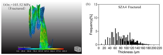 As shown by the specimen SZA4 in Figure 8, a micro-crack appeared at the bottom at σ1 = 87.54 MPa (Figure 8), and its gray value contrast was too small to segment accurately. Therefore, we did not acquire its individual image and thickness distribution. However, we can determine from the 3-D reconstructed image that a primary fracture developed through the specimen along the Z-axis. In addition, a micro-crack developed a branch and cut through in the XY plane. The length and thickness of the branch expanded more than that of the crack in the original direction. At σ1 = 103.52 MPa, the specimen ruptured with several tensile cracks, three of which had not passed through the specimen (Figure 9a). The primary fracture has an oblique angle in the upper part, indicating the existence of a shear fracture in the 0° orientation specimen. Of the micro-crack thicknesses, 99% of the fractured SZA4 range from 10 μm to 194 μm, with most in the 50 μm–110 μm range (Figure 9b).