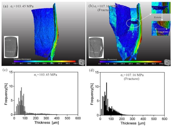Crack propagation pattern of different load stages in SZB4. (a) σ1 = 151.19 MPa; (b) Fractured specimen (after σ1 = 155.76 MPa); (c) crack thickness at σ1 = 151.19 MPa; (d) crack thickness (after σ1 = 155.76 MPa). Rainbow colors represent the thickness value ranges from low to high, and red means highest. The cross-sectional views show the center slice of the specimen.