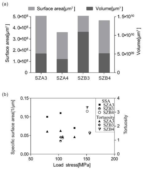Although SSA and tortuosity are positively correlated at different load stages, they display different patterns in different specimens (Figure 13b). For specimen SZA3, the tortuosity of fracture slightly increased, with a new crack developing, then reduced when load stress reached the peak strength of the specimen. Likewise, the tortuosity of specimen SZB4 declined sharply as local cracks grew and became fully fractured. The tortuosity declined as fracturing completed, except for a slight deviation in specimen SZB3. This specimen ruptured with a small part splitting at σ1 = 103.45 MPa (Figure 10), which enlarged the surface area of the entire fracture, and probably caused the slight increase of SSA and tortuosity.