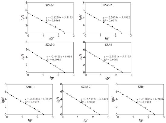 The lgN-lgr scatter plot at different load stages of each specimen (A3-1: SZA3 at σ1 = 79.58 MPa, A3-2: SZA3 at σ1 = 103.45 MPa, A3-3: SZA3 at fractured; B3-1: SZB3 at σ1 = 103.45 MPa, B3-2: SZB3 at fractured).