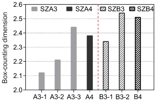 We selected an appropriate threshold value and binarized the cracks of micro-CT image using ImageJ. We picked a cube of 256 × 256 × 256 pixels from center of the specimens and calculated the 3-D BCD from binary images of CT slices, which are listed in Figure 15. The results show good linear relationships between lgr and lgN (R = 0.998 average), which confirm the credibility of 3-D BCD values in reconstructed CT images. As the loading increased in SZA3, 3-D BCD increased from 2.12, 2.21 to 2.44 (Figure 16). The same pattern also appears in SZB3, indicating that the complexity of fracture increased both in the 0° and 90° bedding orientation specimens during the uniaxial compression. Thus, the 3-D BCD can accurately reflect the crack evolution law of shale specimens, the result of which is consistent with the CT scans.