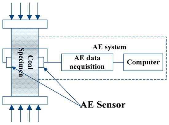 A computer-controlled rock test machine is used to carry out failure test of specimens. The AE equipment that was employed in this study, SAEU2S (Soundwel, Beijing, China), consists of two wide band piezoelectric sensors, two 40 dB amplifiers, and a two-channel data acquisition system. The type of sensor is SR150N (Soundwel, Beijing, China) and the frequency response range is from 22 KHz to 220 KHz. The time parameters for AE signals definition, called Peak Definition Time (PDT), Hit Definition Time (HDT), and Hit Lock Time (HLT) are set to 150 μs, 300 μs, and 500 μs, respectively. The data sampling rate is set to 1MHz. The schematic diagram of uniaxial loading test and AE system is shown in Figure 2.