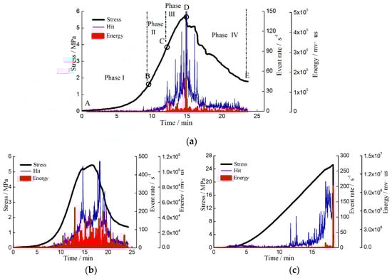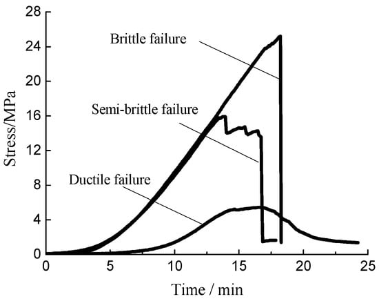 According to the classification of failure modes of rock-like materials [78], the failure modes of coal can be classified into two types: brittle behavior and ductile behavior. For coals in this study, under uniaxial stress, the failure type of outburst risk coal can be viewed as ductile, that of strong bursting coal viewed as brittle type, and that of weak bursting coal is in between the two, can be called semi-brittle type. The typical stress curves of different type coals under a constant loading rate are shown in Figure 7. The failure mode of ductile behavior is progressive, while that of brittle behavior is sudden, and that of semi-brittle is “sudden-progressive” alternating in post-peak phase. It leads to the AE activity pattern difference of different coal specimens before instability. Therefore, the AE activity evolution pattern of coal failure can be classified into ductile, brittle, and semi-brittle pattern. The AE activity evolution of ductile pattern during coal during failure process can be described as stage shift of “activating—rapid increase—gradual decline”. That of brittle pattern can be described as stage shift of “activating-rapid increase”, lack of decreasing stage. That of the semi-brittle pattern can be described as stage shift of “activating—rapid increase—decreasing with pulsing”.