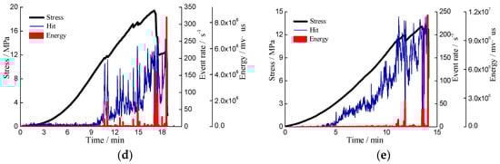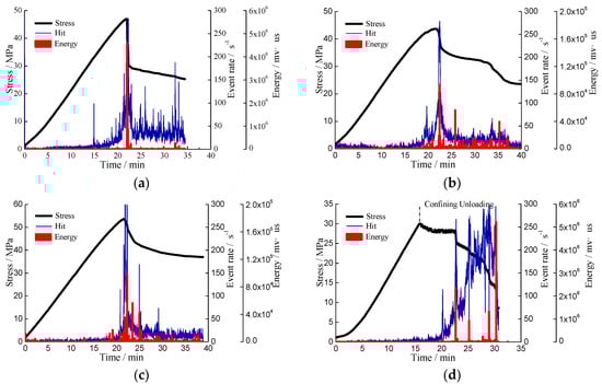 According to test scheme, three conventional triaxial compression tests under different confining pressures (5 MPa, 7.5 MPa, and 10 MPa) and a triaxial unloading confining pressure test were carried out on weak bursting coal specimens S9–12. The temporal variation of stress, AE rate and energy of stressed specimens under different stress conditions are shown in Figure 5.