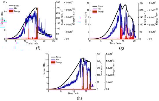 When contrasting the AE parameter evolution results of all the specimens, some differences in the AE activity evolution modes can be found among coals with different properties, although a similar feature also exists. For example, AE activity was increasing with the stress rise before peak strength. The evolutions of deformation phases and AE activity are different among the specimens with different mechanical properties. As shown in Figure 3a,b, in the post-peak phase, the stress drop of stress-strain curve is small and gentle, the variation of coal bearing capacity shows a gradual loss pattern. The failure process of outburst risk coal specimen is a progressive failure process. In post-peak phase, the stress drop of stress-strain curve is small and gentle, and the AE hit and energy decrease gradually. However, the strong bursting coal specimens (Figure 3c–f) exhibit a different response. The post-peak stage is extremely short, or even lacked, the drop of axial stress from peak to the final value is fast and sudden, and the AE activity, especially energy, bursts at the peak stress moment. The response of weak bursting coal specimens (Figure 3g,h) is somehow in between outburst risk and strong bursting coals. The stress changes of weak bursting coal show a “sudden-gradual” alternating drop pattern, and the AE activity demonstrates a general relative rapid decrease trend with some pulsing AE events in the post-peak phase.