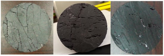 Photos of sectional fissure distribution of typical specimen before failure test. From left to right: specimen from outburst risk seam, weak bursting liability seam, strong bursting liability.