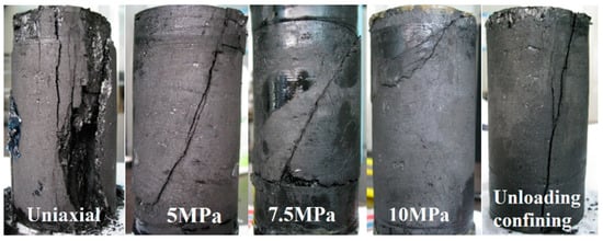 Figure 6 shows the picture of failed specimens under different stress conditions. It can be observed that, with the increase of confining pressure, the main fracture angle to axial main stress direction is increasing, and in the confining unloading condition, the angle is far smaller than the triaxial condition. It indicates that the fracture mechanism of coal specimens was transforming under the effect of external stress.