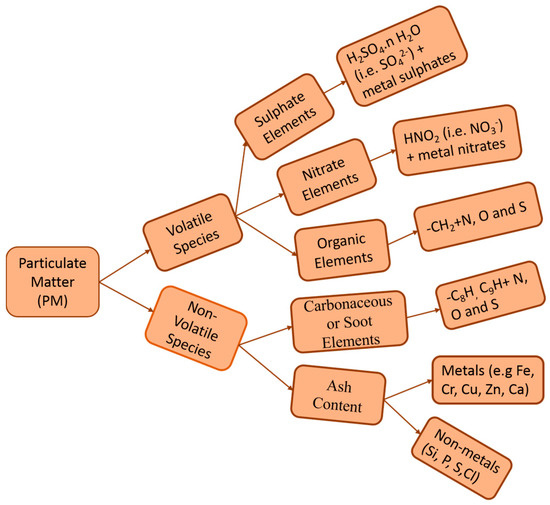 Particulate matter (PM) emitted from GDI-powered vehicles are known to be a complex combination of volatile and non-volatile species. Typically, volatile species contain sulphates, nitrates, and organic elements and non-volatile species contain a carbonaceous fraction and ash. The organic fraction contains thousands of compounds including esters, alkenes, ketones, aromatics, and alcohols [41]. The sulphate fraction includes sulphate ions (SO42−), sulphuric acid (H2SO4), and water-soluble sulphates; however, H2SO4 covers the major proportion of this fraction. The carbonaceous fraction is generated within the engine and its formation is complete by the time the exhaust valve opens (although this fraction can subsequently oxidise in the exhaust at high enough temperatures) while volatile species tend to form later in the exhaust system, or when the exhaust plume enters the surrounding air. The ash fraction consists of metals and also a few non-metals, which are incombustible. A detailed breakdown of PM is depicted in Figure 2.