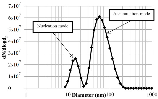 Typical particles from GDI engines can be sorted into two distinct types based on their size, and these are labelled as nucleation mode (less than 50 nm), and accumulation mode (50–200 nm), as shown in Figure 3 [51].