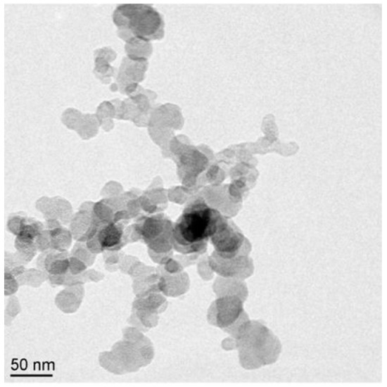 Accumulation mode particles generally lie in the size range 40–200 nm. Their formation is thought to occur when fuel molecules undergo pyrolysis at high temperatures, using the processes described in Section 2.1 to form carbon spherules, which are found to be approximately 15–40 nm in diameter [58]. Two processes can then cause these particles to grow; firstly gaseous phase species in the exhaust condense and adsorb onto these spherules, causing them to grow—the composition of some of these condensed species leads to some of the concerns around the health effects of particulates. The larger the surface area of these spherules gives a greater area to adsorb onto. The second process is that these spherules can agglomerate by colliding and sticking together using a sintering process, [59] which produces particles with a fractal like shape (technically, accumulation mode particles are aggregates rather than agglomerates, as the forces that hold them together are chemical or sinter-like forces, whereas an agglomerate is held together by physical forces (e.g., Van der Waal’s) and the primary particles retain their original shape—clearly not the case here. Accepted terminology however, seems to be to refer to them as agglomerates.) [60]. This can clearly be seen in Figure 4, a microscope image of an accumulation mode particle, showing a large fractal like shaped accumulation mode particle [51].