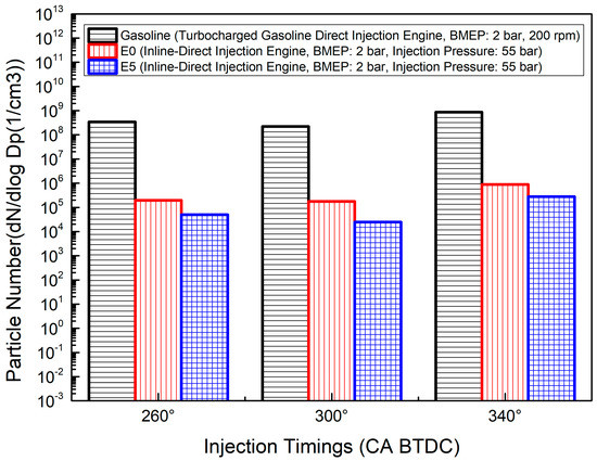 Szybist et al. [68] reported that, in their work, fuel injection timing had the greatest impact on PM emissions from GDI engines: too advanced an injection timing led to fuel spray impingement on the piston which resulted in higher particulate matter emissions, however, a retarded injection timing led to insufficient time for air-fuel mixing. He et al. [2] reported the impact of fuel injection timings on PN emissions from GDI engine without using catalyst, they found that PN emissions were dominated by the accumulation of particulate matter and could be reduced by retarding the fuel injection timing. Qin et al. [69] studied the impact of injection timings (260°, 300° and 340° CA bTDC) on particle number (PN) emissions from a turbocharged GDI engine. They found that as injection timing was advanced (260° to 300° CA bTDC), particle number emissions initially decreased then subsequently increased after 340° CA bTDC. On the other hand, Cho et al. [72] investigated the impact of injection timing (260° to 340° CA bTDC) and found that PM emissions slightly decreased for retarded injection timing at 280° CA bTDC and then increased to 340° CA bTDC. The effects of injection timing variation on PM number emissions are summarized in Figure 6.