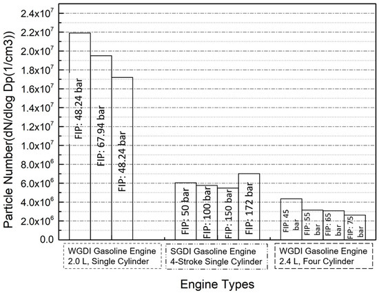 The impact of fuel injection pressure (FIP) variation on particulate number emissions. (presented data from left to right are taken from [2,73], respectively).