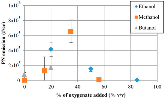 PN emissions a single cylinder optical engine for fuels with varying levels of oxygenates, the error bars correspond to ± σ [142].