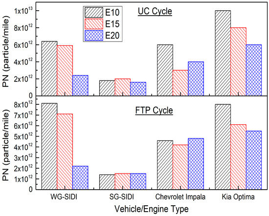 He et al. [2] found that ethanol blends showed mixed effects on PN emissions depending on engine operational parameters. Generally, ethanol blend (E20) decreases particle number emissions at low and medium loads condition. But in some cases, when the liquid fuel impingement arises on the piston head or cylinder wall then E20 generates more PN emissions as compared to gasoline and this may be attributed to the higher heat vaporisation of ethanol. Francesco et al. [145] examined the ethanol blends combustion in a GDI optical engine without using a catalyst. At 2000 rpm and full load the particle number (PN) concentration decreased by increasing the ethanol percentage in gasoline, whilst at 4000 rpm and partial load an increase of particle number were observed for E50 and E85 fuels. This is most likely because of a higher fuel impingement on the piston head and the volatility properties of ethanol/gasoline blends. Wang et al. [73] investigated the impact of ethanol-blended fuel on a spray guided GDI engine. They found that addition of ethanol into gasoline fuel significantly reduced particle mass, but increased PN emission as compared to gasoline. Karavalakis et al. [1,85] studied the PM emissions from a wall guided spark ignition engine over the Federal Test Procedure (FTP) Cycle and Unified Cycle (UC) burning different ethanol blends. They found that particle number generally decreased with the addition of ethanol, implying that oxygen content in the fuel was the primary factor for particle number decreasing by allowing the suppression of soot formation. Figure 9 shows the impact of ethanol fuel blends (E10, E15, E20) on PN emissions over FTP and UC cycle [1,85].