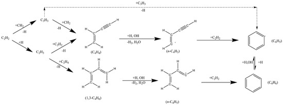 Particulate formation in the combustion chamber is a complex mix of chemical and physical processes (pyrolysis, nucleation, oxidation, piston wetting, carbonisation, particle coagulation and agglomeration) [15,27,28,29]. Pyrolysis is the primary contributor of particle formation in the combustion chamber. In thermal pyrolysis (without oxygen at a temperature of more than 400 °C) fuel molecules break up into hydrogen (H), hydroxide (OH) and methyl (CH3) radical molecules and organic compounds e.g., ethylene (C2H4) and acetylene (C2H2). This reaction is dehydration with high activation energy. These radicals and organic compounds begin to create polycyclic aromatic hydrocarbons (PAHs), which originates soot particles known as soot precursors. After passing through an inception process, these soot precursors become primary soot particles. Primary particles grow into larger particles because of surface growth reaction of Acetylene (C2H2), organic compound addition, hydrogen atom transfer (HAT), and hydrogen abstraction acetylene addition (HACA) mechanisms with ‘growth species’ such as PAHs and C2H2. Growth of the larger particles occurs as a result of the collision between smaller particles forming non-spherical shape agglomerates [15,30]. A proposed chemical mechanism for the initial formation of aromatic species during combustion is shown in Scheme 1.