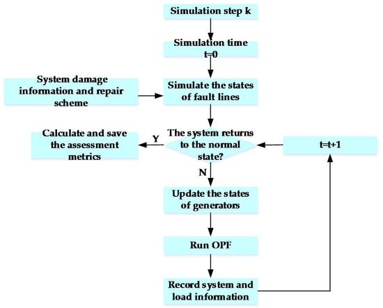 After obtaining the state of each component, the power system state should be analyzed. To reduce the losses of outage, this paper takes the minimum amount of load shedding as the objective and uses DC OPF to solve the problem if necessary. Then the metrics proposed in Section 2.2.1 are calculated.