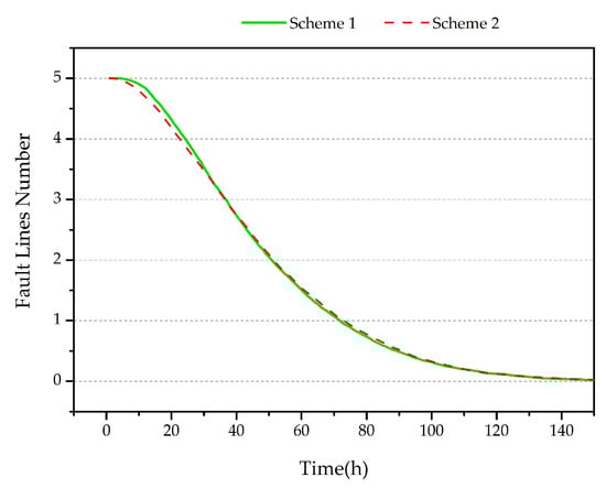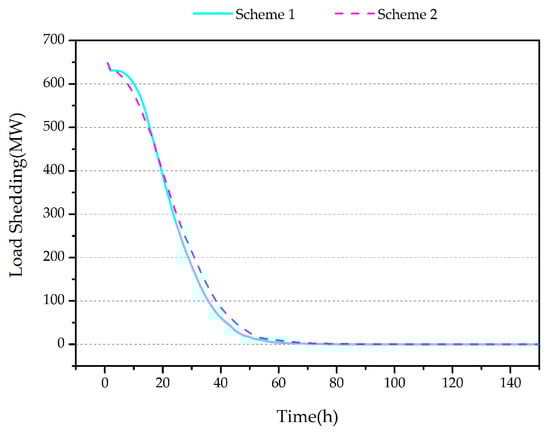By analyzing the restoration process curves in Figure 6 and Figure 7, it can be found that in the initial stage of restoration, the amount of load shedding drops rapidly; this is because the DGs on nodes with load loss can take the lead in restoring important load, which improves the restoration efficiency. In the early stage of system restoration, the restoration speed of Scheme 2 is higher than that of Scheme 1, and the load shedding amount of Scheme 2 declines more sharply. While in the middle and later stages, the situation is just the opposite, which applies equally to the repair process of fault lines.