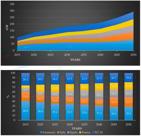 PV technology is an essential pillar for transforming our energy systems into one based on renewable and sustainable energy sources []. The share of renewable electricity production represented 24.5% of all electricity produced globally in 2016, of which PV technology accounted for 1.5%. PV systems have largely penetrated the global energy market, especially in Europe. In 2016, the global solar PV capacity was 303 GW, with the largest proportions being the European Union’s 106 GW, China’s 77.4 GW, Japan’s 42.8 GW, and the USA’s 40.9 GW [,,]. Today, in many emerging markets, PV technology is considered a cost-competitive source for increasing electricity production and for providing energy access. Nonetheless, markets in most locations continue to be driven largely by regulations or government incentives [,,]. The European Union became the first region to pass the 100 GW milestone in 2016 [,]. Germany, France, Italy, and Spain have a prominent role in the spread of PV technology in Europe. Based on reference data, by 2050, the net PV production capacity in the EU will be +197.3 GW higher than in 2015 [] (Figure 1).