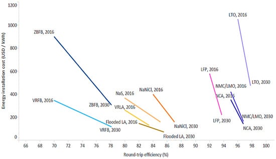 Energy round-trip efficiencies and installation costs of electrochemical technologies, 2016–2030 []. Abbreviations: LA = lead-acid; VRLA = valve-regulated lead-acid; NaS = sodium sulphur; NaNiCl = sodium nickel chloride; VRFB = vanadium redox flow battery; ZBFB = zinc bromine flow battery; NCA = nickel cobalt aluminium; NMC/LMO = nickel manganese cobalt oxide/lithium manganese oxide; LFP = lithium iron phosphate; LTO = lithium titanate.