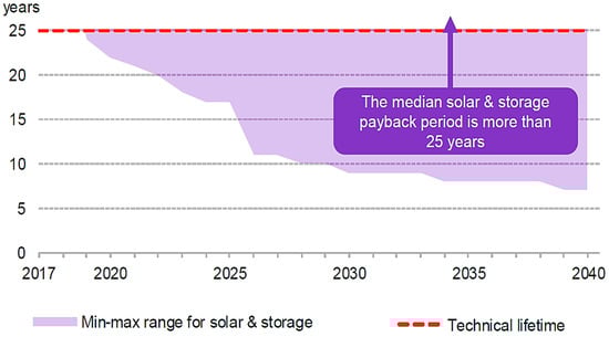 In the future, energy storage will play an increasingly important role in enabling the effective integration of photovoltaic energy and unlocking the benefits of local generation and a resilient, green energy supply. Storage and transmission have a synergistic effect on decreasing the average CO2 emissions and the electricity price and it allows the achievement of more challenging targets for CO2 emissions at a lower cost. Grid operators all over the world must manage the variable PV energy generation more efficiently. Due to the current EU project development trends new flexible energy storage systems have mainly been concentrated in the highly developed economic regions. Without governmental support it is difficult to successfully implement energy storage system projects because despite the rapidly falling costs these investments are still expensive. This economic aspect will be improved greatly by the development of electrochemical storage systems in the future because according to forecasts the installation costs of battery storage systems will be significantly reduced by 2030 (Figure 2) [,,,,]. The Bloomberg New Energy Finance study showed in the case of household size that the median flexible storage photovoltaic system payback period is more than 25 years in 2018 [] (Figure 3). An important question is whether it is possible in the European Union to achieve a payback of the costs of flexible storage photovoltaic system investments for residential customers considering the technology-specific storage aspects prevalent in 2018.
