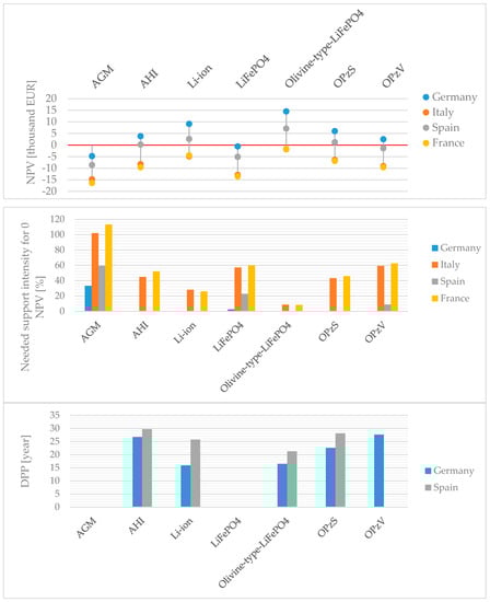 The DPP of the Olivine-type-LiFePO4 and the Li-ion batteries are around 15 years. Li-ion and the Olivine-type-LiFePO4 batteries have the best NPVs, and these are the most cost-effective technologies among of the studied systems. Building a flexible storage system with these batteries can be profitable in Germany and in Spain within 30 years. OPzS and AHI also have positive NPVs in both countries, and the OPzV have a positive NPV in Germany. Only the AGM and the LiFePO4 batteries have negative NPVs in all studied countries. Figure 7 shows the results of the economic calculations. Besides the NPV, the support intensity needed for 0 NPV in percentage of the total investment cost and the DPP are also calculated. For the spread of safe decentralized energy production and flexible storage PV systems in Europe it would be effective to implement a California-like “Self-Generation Incentive Program” support system. Using flexible storage PV systems in the future can be a goal of every country that does not want to lose “the race for green energy.”