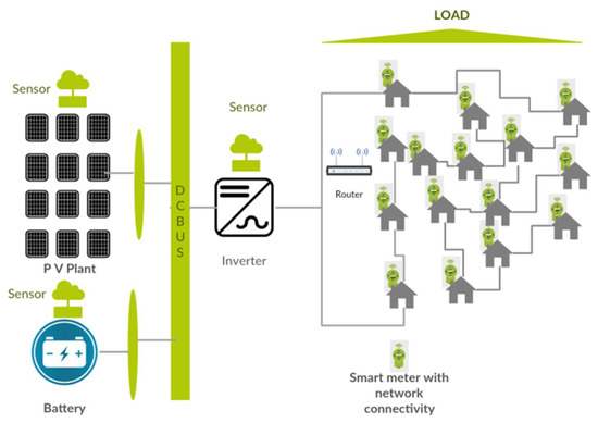 This microgrid consists of a solar power generation system with battery back-up. An inverter is represented after the DC bus bar, which supplies the AC power to the connected load. In a typical application, microgrids are mainly used to power rural areas without electricity access. Hence, the load characteristics considered here are strictly in lieu with typical residential electricity consumption profiles. The microgrid architecture also illustrates sensors connected to each generation node, inverter and battery. This is to facilitate monitoring and control of generation and transmission. The houses to which the grid is connected are assumed to have interactive smart meters, details about which are discussed in Section 3.