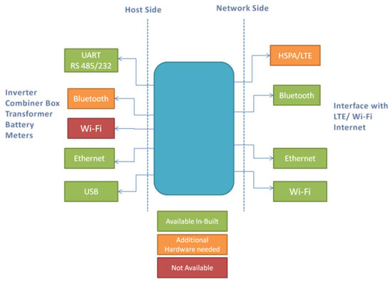 The devices that require integration with sensors are inverter, PV converter, battery, individual meters, and weather station if any installed. With the advent of fourth industrial revolution, these elements are being released with at least one of the following communication interfaces: enabled Bluetooth 4.0 (BLE or Bluetooth Smart), IEEE 802.11 g (Wi-Fi), IEEE 802.3 (ethernet), GPRS (2G telecom), HSPA (3G telecom) or Modbus Remote Terminal Unit communication. Microcontrollers available today come with most of these communications enabled with built-in two-way communication. Sometimes, additional hardware can also be used with a microcontroller to facilitate communication between the elements that need monitoring. Figure 4 illustrates the communication interface capabilities of a widely used microcontroller raspberry pi, which can be used in the applications like this research work.