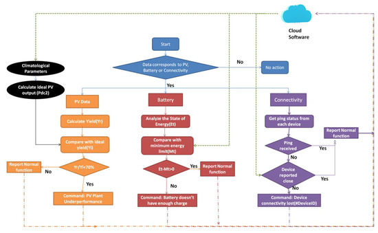 Photovoltaic power generation, battery status and network strength are the three elements for which rules are established for performance monitoring. These parameters are continuously monitored for every 15 min and any related event is immediately reported. The rule base for each of the aforementioned three issues is illustrated in Figure 7.