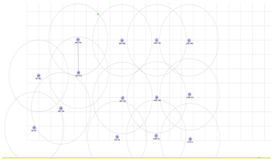 NSG2 (3.27, DARPA, Arlington, VA, USA) software is used to build the architecture of the mesh network described in this research work. Figure 11 illustrates the simulation of a wireless mesh network for the microgrid. Node N0 to N8 represent the consumption side while N12, N15 represent the PV converter and battery side of the network connection. N9 is the inverter node and N17 is the node of router that is used for boosting network availability. N9 is connected to N17 via wire where the data is cumulated in the local database.