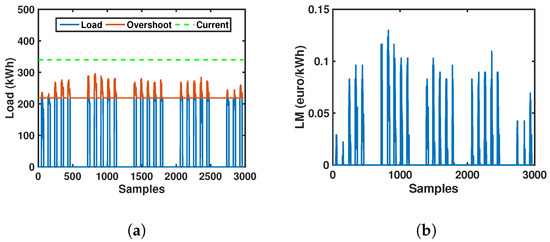 For the CEA case, the counterpart to Figure 2 is shown in Figure 3. Load consumption and the time instants when it overshoots the optimal power limit (red line) are shown in Figure 3a. Note that, for the currently contracted level (green dashed line), we can see that the optimal level is well below the contracted one, which in this case implies that in the equilibrium point it is preferable to allow some overshoots. LMs and their discrete representation are shown in Figure 3b,c, respectively. In the PDF distribution shown in Figure 3d, we observe a different distribution profile compared with the HUF case for these same conditions, where it is noticeable a trend to zero value. Finally, in Figure 3e,f, the average values by bootstrap replication and its bootstrap distribution are shown, respectively. These statistical profiles are much alike the ones in the HUF case example, and again, they are including the information about the overshoots for the optimized problems, hence it represents a robust statistical measurement and characterization of the dynamics, which in turn can be readily compared with other situations. Hence, the use of sensitivity analysis in combination with bootstrap resampling yields a unified and robust representation of the underlying dynamics, which is subsequently analyzed in the next subsection.