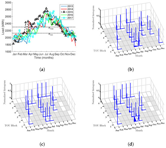 Bootstrap sensitivity analysis in HUF: (a) monthly load profile representation for the available data; and (b–f) mosaic representation of mean distributions by month and TOU blocks, for Years 2013, 2014, 2015, 2016 and 2017, respectively.