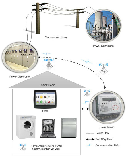 In our proposed model, a smart home consisting of various electrical appliances including washing machine, refrigerator, and cloth dryer etc. A smart meter is installed providing a two-way communication from smart home to the power distribution company. The similar communication takes place between power distribution and transmission. Finally, transmission is connected with power generation with a two way communication link. All appliances are capable to communicate with each other using home area network (HAN) [27,28,29]. The flow of power between the utility and SM is shown by the bold line in Figure 1 and this work is the extension of [5,30]. The communication between EMC, SM and utility is carried out using the wifi or wimax technology. The flow of information between the utility and EMC is bidirectional. We use the DA-RTP and CPP schemes to calculate the electricity cost of multiple homes (single, twenty and fifty homes).