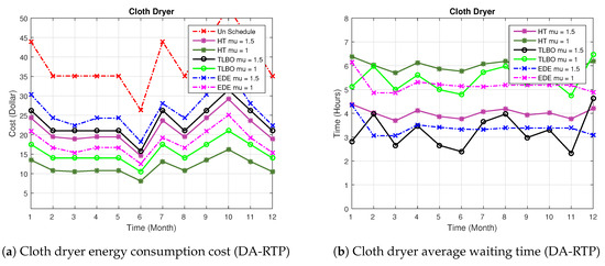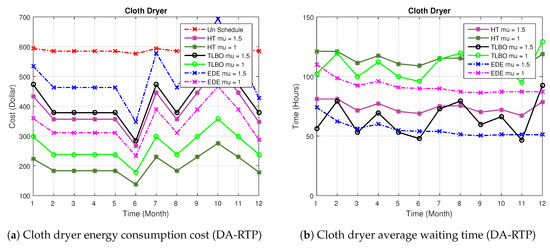 - Cloth DryerThe clothes dryer is one of the most energy consuming appliances in the residential sector, but a little work need to be done to schedule its energy consumption stages of clothes dryer in such a way that the consumer will pay the minimum cost. We consider both pricing signal (DA-RTP and CPP) and evaluate the performance of cloth dryer on the basis of cost and delay of appliances. We measure the performance of cloths dryer for a year and calculate the average for a month. Simulations for cloths dryer energy consumption cost and delay of appliances are shown in Figure 16a,b. By utilizing the DA-RTP signal, optimization techniques HT, TLBO and EDE show 45%, 37% and 31% reduction in cost respectively with a priority of 1.5. If we decrease the priority to 1.0 then HT, TLBO, EDE reduce cost up to 67%, 57% and 52% reduction in cost respectively. In the same scenario HT, TLBO and EDE show an average delay of 75 h, 65 h and 56 h per month respectively with a priority of 1.5. When the priority of appliances is reduced to 1.0 then HT, TLBO, EDE show delay of appliances 114 h, 109 h and 92 h respectively. Simulation results evaluation show that there is a tradeoff between the delay of appliances and cost.