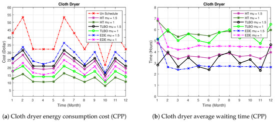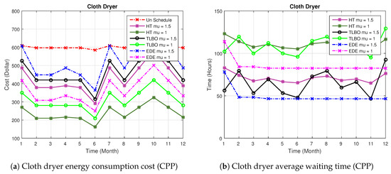 Table 3. Cloth dryer performance (CPP).In the second scenario, the same number of appliances is considered with CPP. It reduces the risk of high price in RTP. Simulation results for cost and average waiting time are shown in Figure 3a,b. When CPP signal is used, cloth dryer shows 42% and 65% reduction in cost using HT. TLBO and EDE show 37% and 28% decrease in cost, respectively with the priority of 1.5. When the priority of appliances is reduced to 1.0, TLBO and EDE show reduction in cost 58% and 50%, respectively.