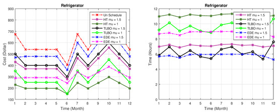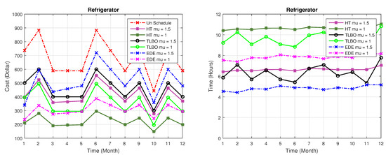 Figure 13. Scenario 1: Refrigerator behavior with (CPP). - DishwasherWe divided the energy consumption stages of dishwasher into three parts heated dry, main wash and final rinse. We schedule load among these energy consumption stages in such a way that the consumer will pay the minimum cost. Simulations for dishwasher energy consumption cost and delay of appliances are shown in Figure 14a,b. DA-RTP signal is utilized to find the energy consumption cost by using optimization technique HT, TLBO and EDE show 28%, 21%, 17% reduction in cost respectively with a priority of 1.5. When the priority is reduced to 1.0 then HT, TLBO and EDE show 54%, 48% and 44% reduction in cost respectively. If we consider the dishwasher delay then HT, TLBO and EDE show 35 h, 33 h and 27 h respectively with a priority of 1.5. when the priority of appliances is reduced to 1.0 then HT, TLBO and EDE show 75 h, 63 h and 44 h respectively. CPP signal is also utilized for dishwasher energy consumption scheduling, simulation results for CPP are shown in Figure 15a,b, which show that HT, TLBO and EDE show 43%, 41% and 34% reduction in cost respectively with a priority of 1.5. While priority is reduced to 1.0 the performance of HT, TLBO and EDE is increased up to 83%, 72% and 51%. In our scenario, the critical event occur twice in a year. If we consider the delay of dishwasher then HT, TLBO and EDE show 43 h, 41 h and 34 h respectively with a priority of 1.5. If the priority is reduced to 1.0 then average delay per month increase up to 83 h, 72 h and 51 h respectively.