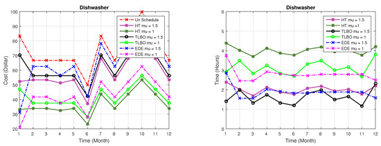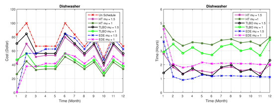 Figure 20. Scenario 2: Dishwasher behavior with (DA-RTP).Simulation are also conducted for CPP and simulation results are shown in Figure 21a,b, which show that HT, TLBO and EDE show 31%, 21% and 20% reduction in cost respectively with a priority of 1.5. While priority is reduced to 1.0 the performance of HT, TLBO and EDE show 60%, 48% and 45%. If we consider the delay of appliances then HT, TLBO and EDE show 43 h, 41 h and 34 h respectively with a priority of 1.5. If the priority is reduced to 1.0 then average delay per month is 83 h, 72 h and 51 h respectively.