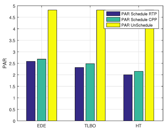 The best pattern of appliances scheduling is selected where consumer attains minimum cost and maximum user satisfaction for each month. Figure 8 illustrates the PAR using our implemented techniques and unscheduled electricity consumption. Simulation results show that HT achieves minimum peaks as compared to TLBO and EDE and unscheduled PAR using DA-RTP and CPP signals. HT reduces 60% PAR, while TLBO and EDE reduce 50% and 45% PAR, respectively using DA-RTP. In case of CPP, HT achieves minimum PAR, while TLBO and EDE reduce the PAR 48%, 44%, respectively.