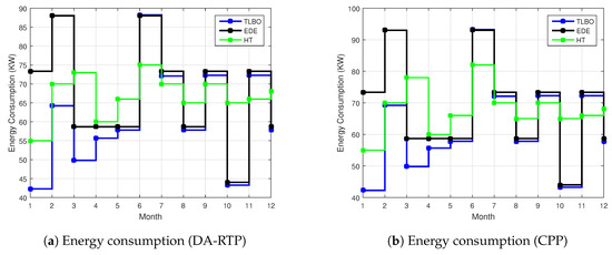 Electricity consumption of appliances depends on power rating and LOT. Figure 9a,b show the monthly electricity consumption schedule of three considered appliances. Simulation results demonstrate that HT reduces peaks as compared to TLBO and EDE. TLBO shows peaks in 2nd and 6th months with 86 kW and 77 kW, with DA-RTP. HT has maximum peak power consumption of 78 kW and 82 kW in 3rd and 7th months. However, HT shows minimum peaks as compared to TLBO and EDE.