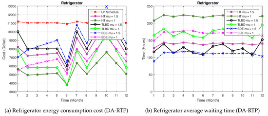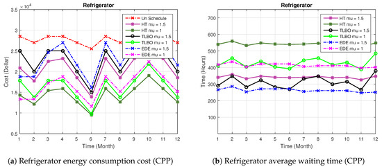 Figure 5. Refrigerator energy consumption cost and waiting time with (CPP). - DishwasherA dishwasher is an ideal appliance for DSM due to short duty cycles and high energy consumption. Figure 6a,b demonstrate the average waiting time and cost of dishwasher for one month. Simulation results for dishwasher are summarized in Table 6 and Table 7. Two-time factors are used for dishwasher, where the large time factor means higher priority and it leads to shorter time. We use four heuristic techniques to find out the best time schedule for a dishwasher at the minimum cost. Simulation results illustrate that HT, TLBO, EDE show 19%, 15% and 10% reduction in cost, with the priority of 1.5. If dishwasher is switched ON at a priority of 1.0 then HT, TLBO, EDE achieve 48%, 40%, 37% reduction in the cost with average delay of 3.72, 3.11, 2.35. By comparing results, we find that the performance of HT is the best in terms of cost and waiting time. If we comparatively see the simulation results then HT shows maximum delay.