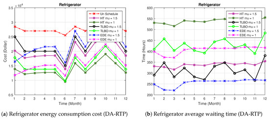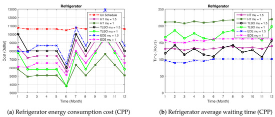 Table 5. Refrigerator performance (CPP).If refrigerator is switched ON with the priority of 1.0 then TLBO and EDE reduce the cost up to 51% and 48%, respectively.From comparative analysis, it is observed that HT performs better as compared to TLBO and EDE in terms of cost. However, HT have maximum delay as compared to the other heuristic techniques. CPP plays a vital role in demand response electricity markets. Simulation results for cost and average waiting time with cpp are shown in Figure 5a,b, respectively. In RTP, high prices risk can be reduced by utilizing CPP. In the scenario of CPP, the refrigerator shows 30% and 58% reduction in the cost using HT. TLBO and EDE show 25% and 11% reduction in the cost, respectively, with the priority of 1.5.