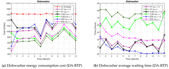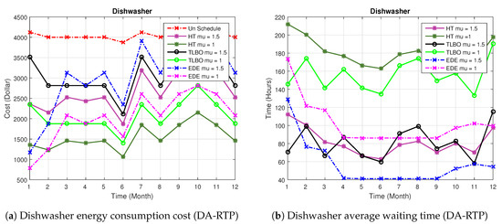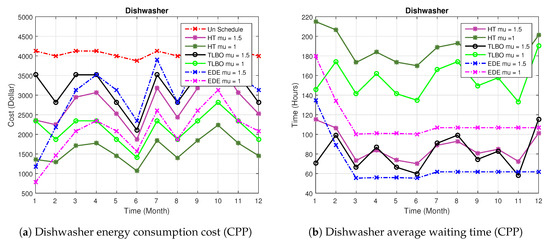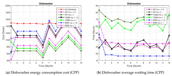 Table 7. Dishwasher performance (CPP).We check the performance of optimization techniques on different appliances by using the CPP signal. Simulation results for dishwasher average waiting time and cost are shown in Figure 7a,b. Simulation results illustrate that HT, TLBO, EDE show 14%, 7%, 5% with an average delay of 2.11, 2.02 and 1.45 h respectively with the priority of 1.5. If priority of the appliance is reduced to 1.0, simulation results illustrate that HT, TLBO and EDE achieved 45%, 38% and 36% reduction in the cost with average delay of 4.11, 3.77 and 2.75 h respectively. HT obtained the best performance in terms of cost; however, the delay is maximized.