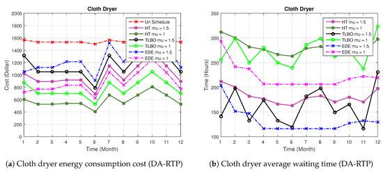 - Cloth DryerWe consider the cloth dryer along with both pricing signals (DA-RTP and CPP) and analyze the performance of cloth dryer on the basis of cost and delay of appliance. We measure the performance of cloth dryer for a year and calculate the average for a month. Simulations for cloths dryer energy consumption cost and delay of appliances are shown in Figure 10a,b. By utilizing the DA-RTP signal, optimization techniques HT, TLBO and EDE achieve 33%, 29% and 13% reduction in cost respectively with a priority of 1.5. If we decrease the priority to 1.0 then HT, TLBO and EDE show 65%, 55% and 42% reduction in cost respectively. In the same scenario HT, TLBO and EDE show an average delay of per month respectively with a priority of 1.5. When the priority of appliances is reduced to 1.0 then HT, TLBO and EDE show 114 h, 109 h and 92 h delay of appliances respectively.Simulation results show that there is a tradeoff between the delay of appliances and cost.